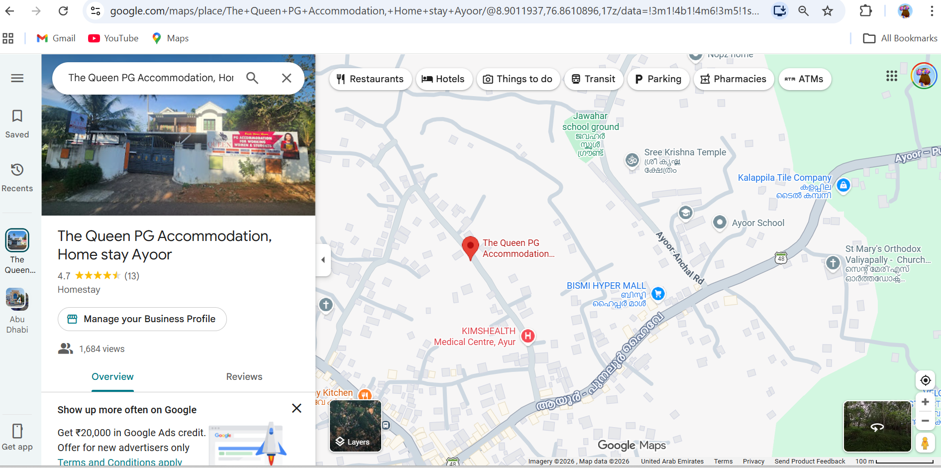 The Queens PG Accommodation project focused on establishing a dominant local digital presence for a premiunm residential service in Ayoor.I spreadheaded the creation and optimization of the Google Business profile,ensuring that all essential business information,contact details,and location data were accurately represented to build trust with potential residents.